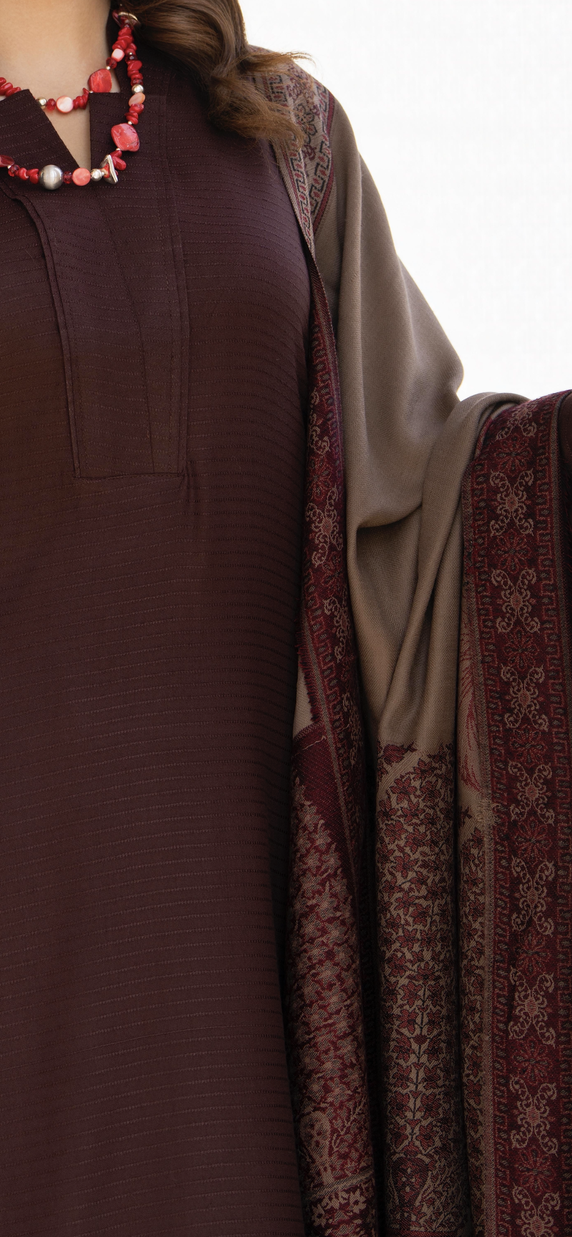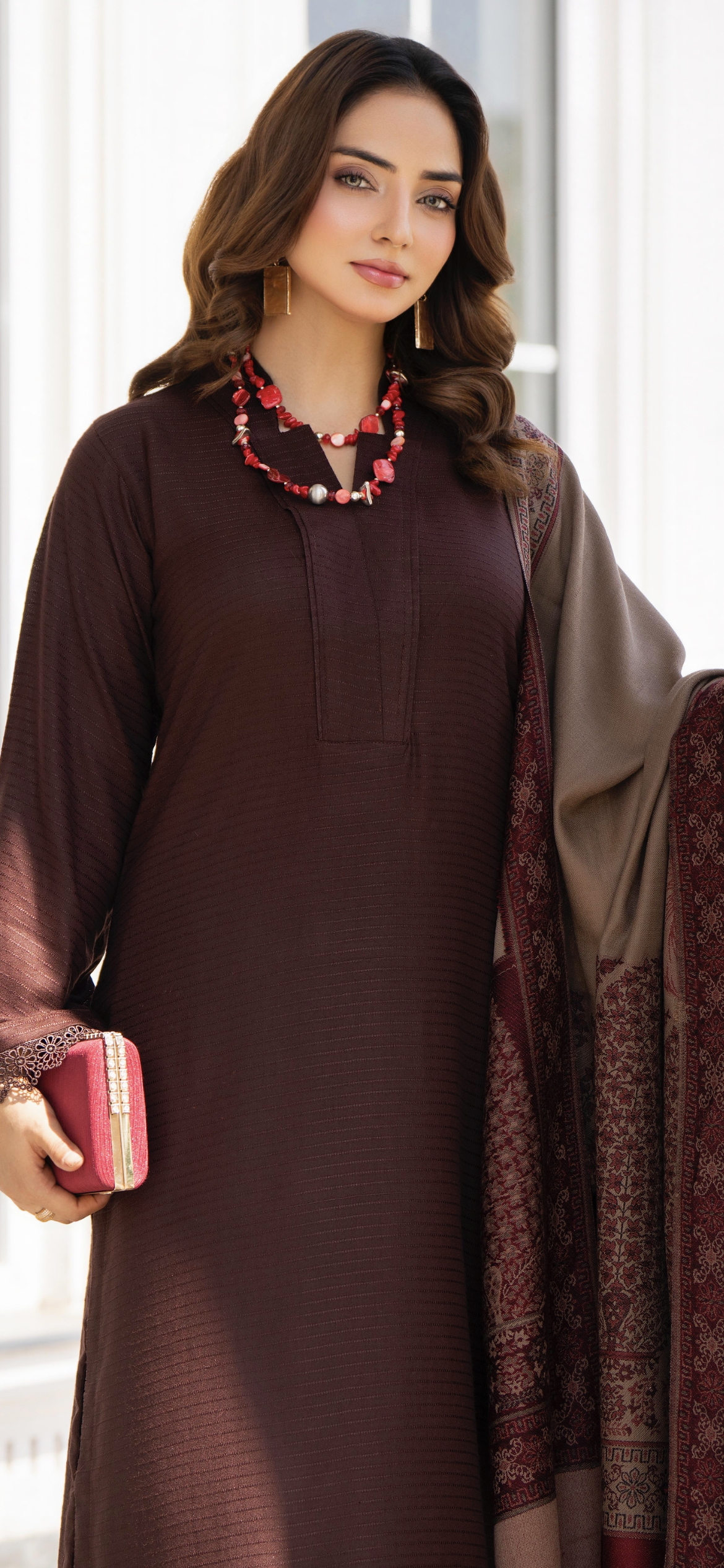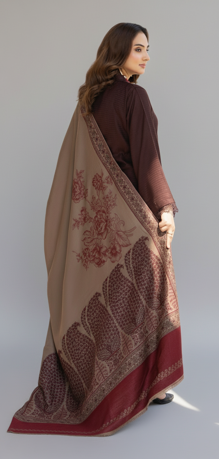 • A lovely simple addition to your winter wardrobe with these winter Dhanak 3pc suit with Embroided Shawl. Long kameez with trousers to match.