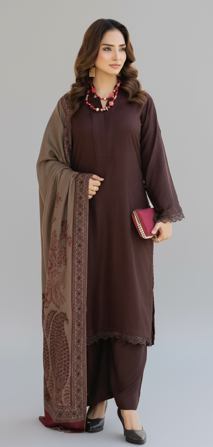 A lovely simple addition to your winter wardrobe with these winter Dhanak 3pc suit with Embroided Shawl. Long kameez with trousers to match.