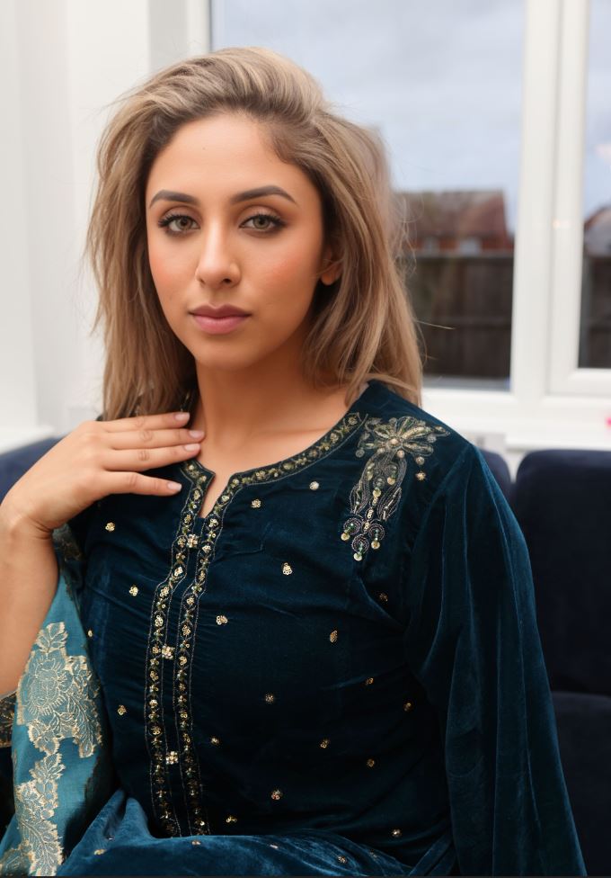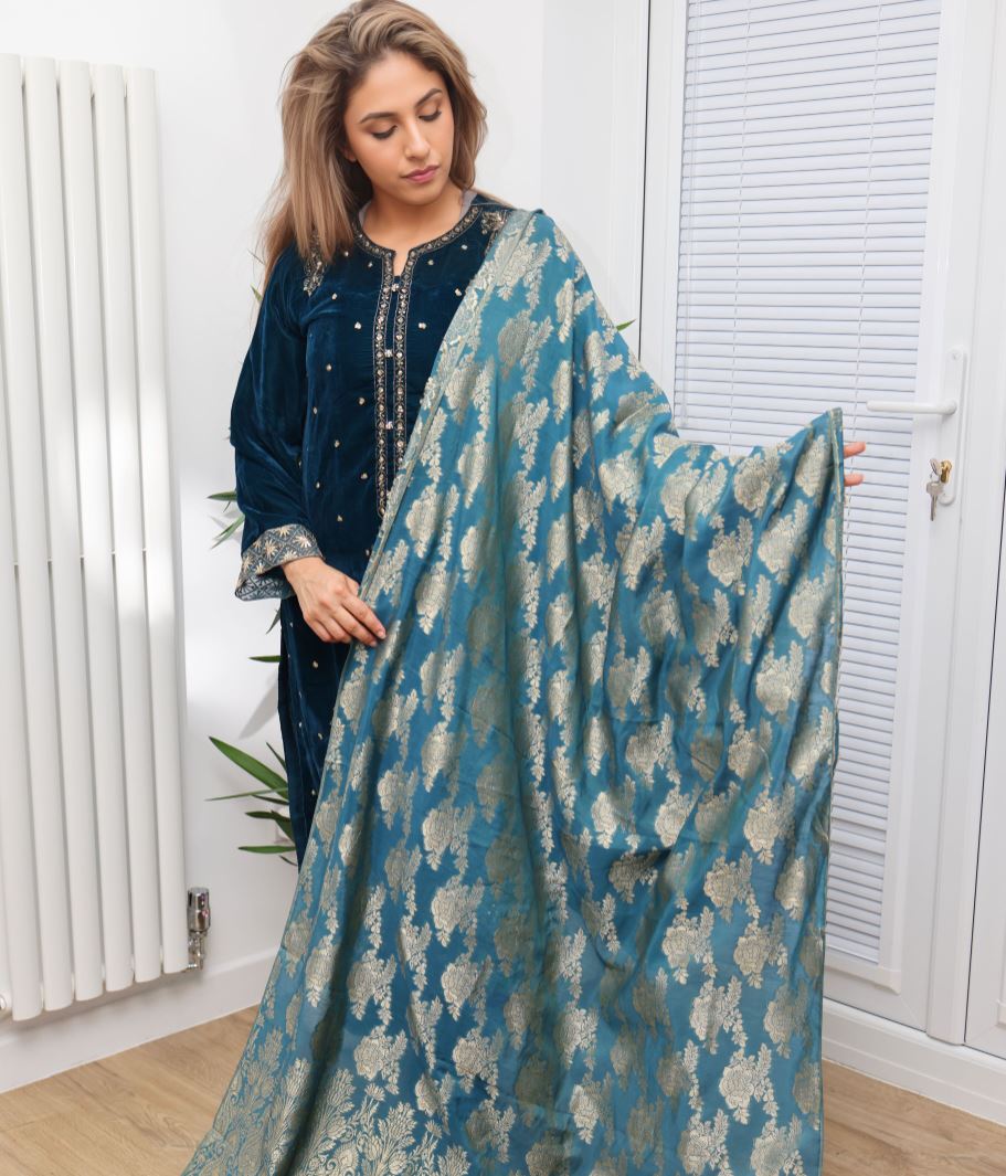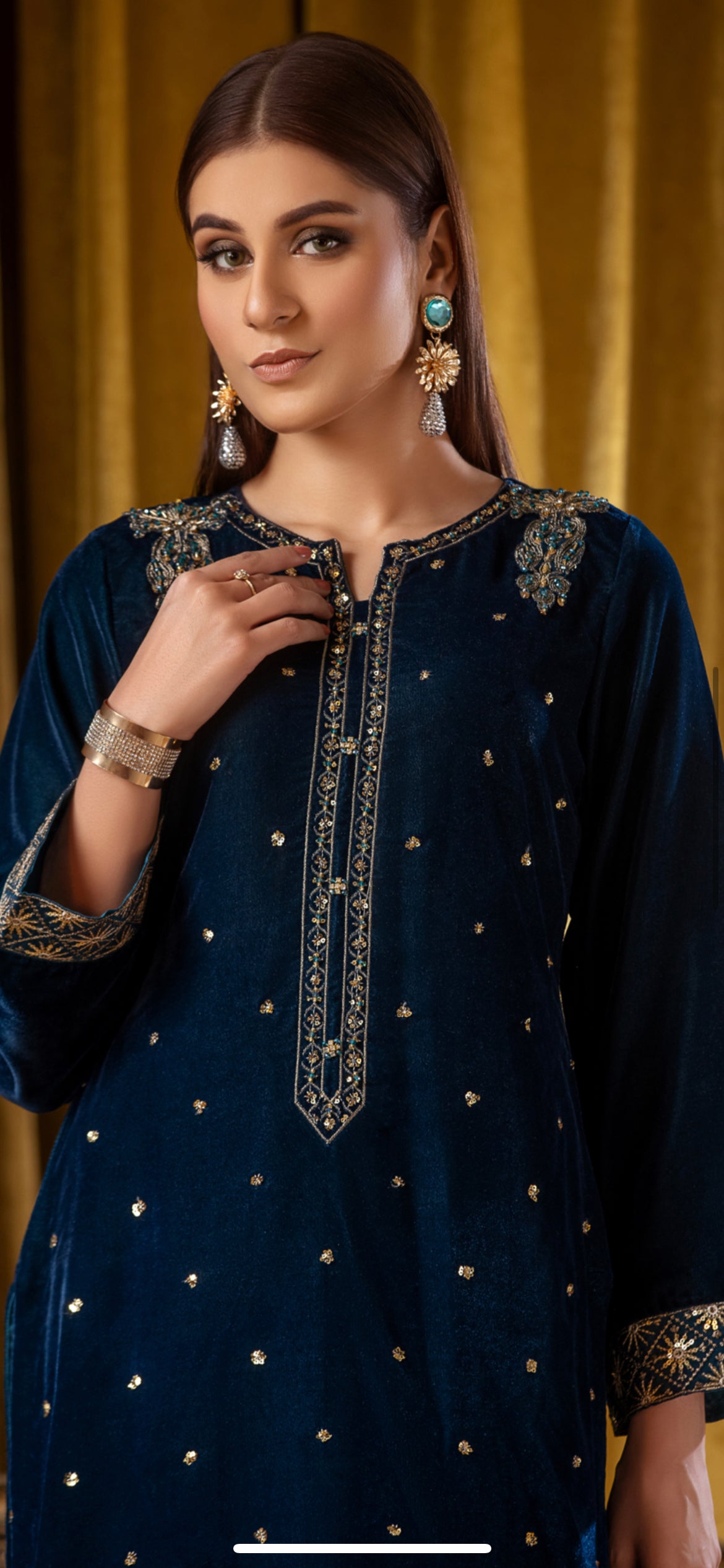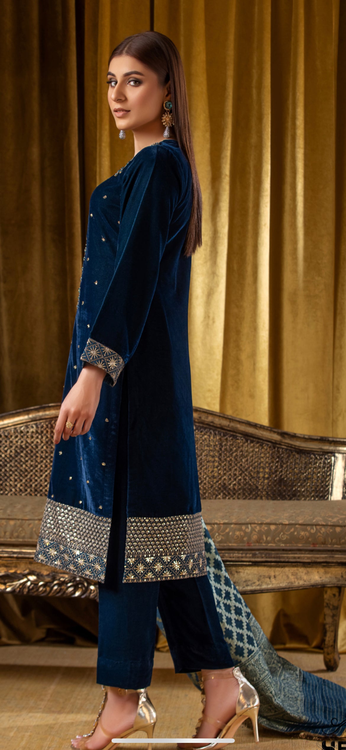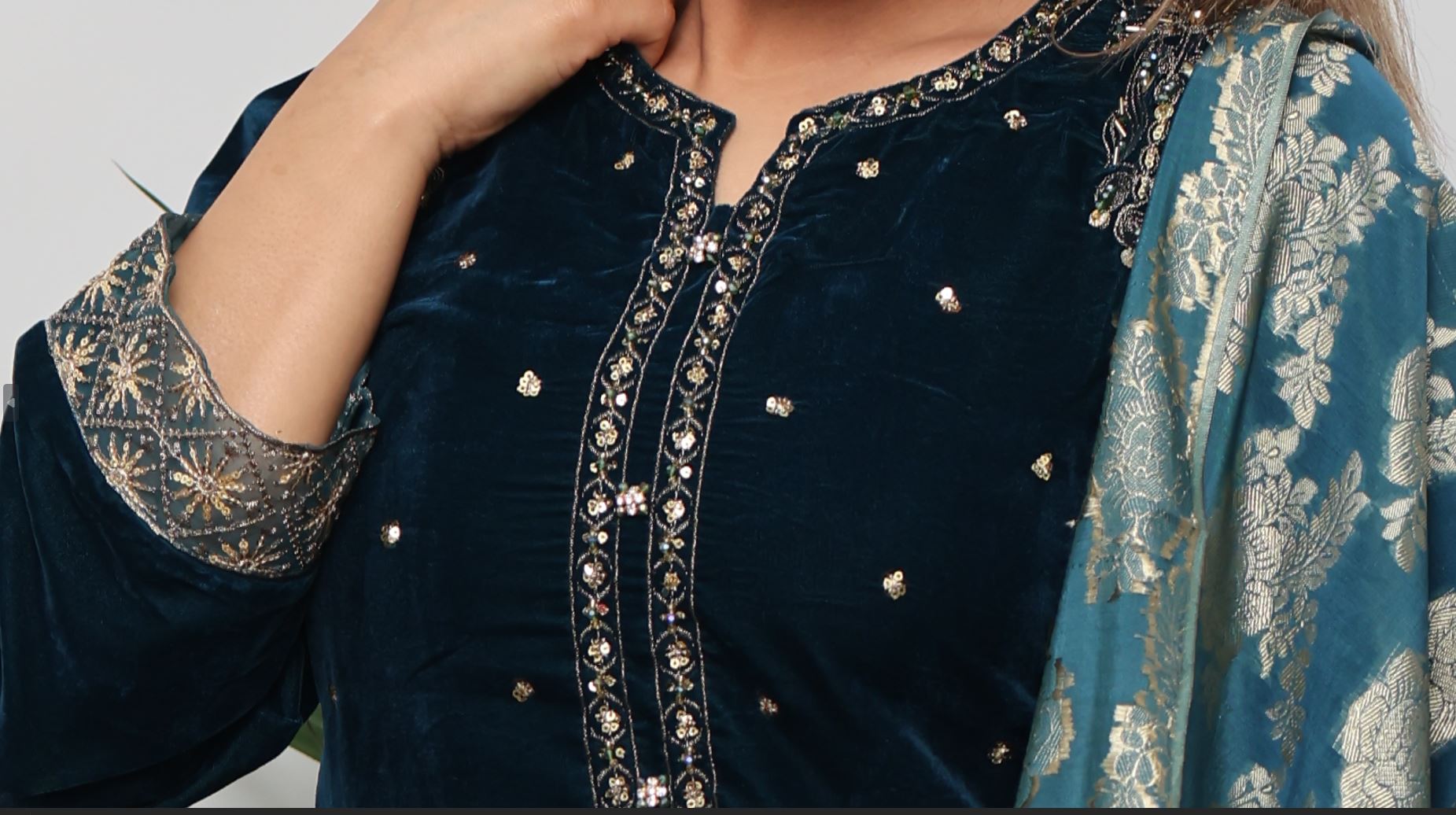 3 pcs Cotail Velvet suit Kameez has gold thread detailing on the neckline, arms and border. Has beadwork detailing on the shoulder and scattered sequins on the kameez.